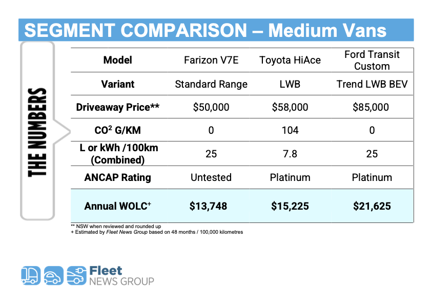Based on a typical fleet lifecycle of 48 months and 100,000 kilometres, the new electric entrant — the Farizon V7E — delivers the lowest annual WOLC in the segment, comfortably ahead of the long-standing segment leader and well clear of the premium-priced electric alternative.